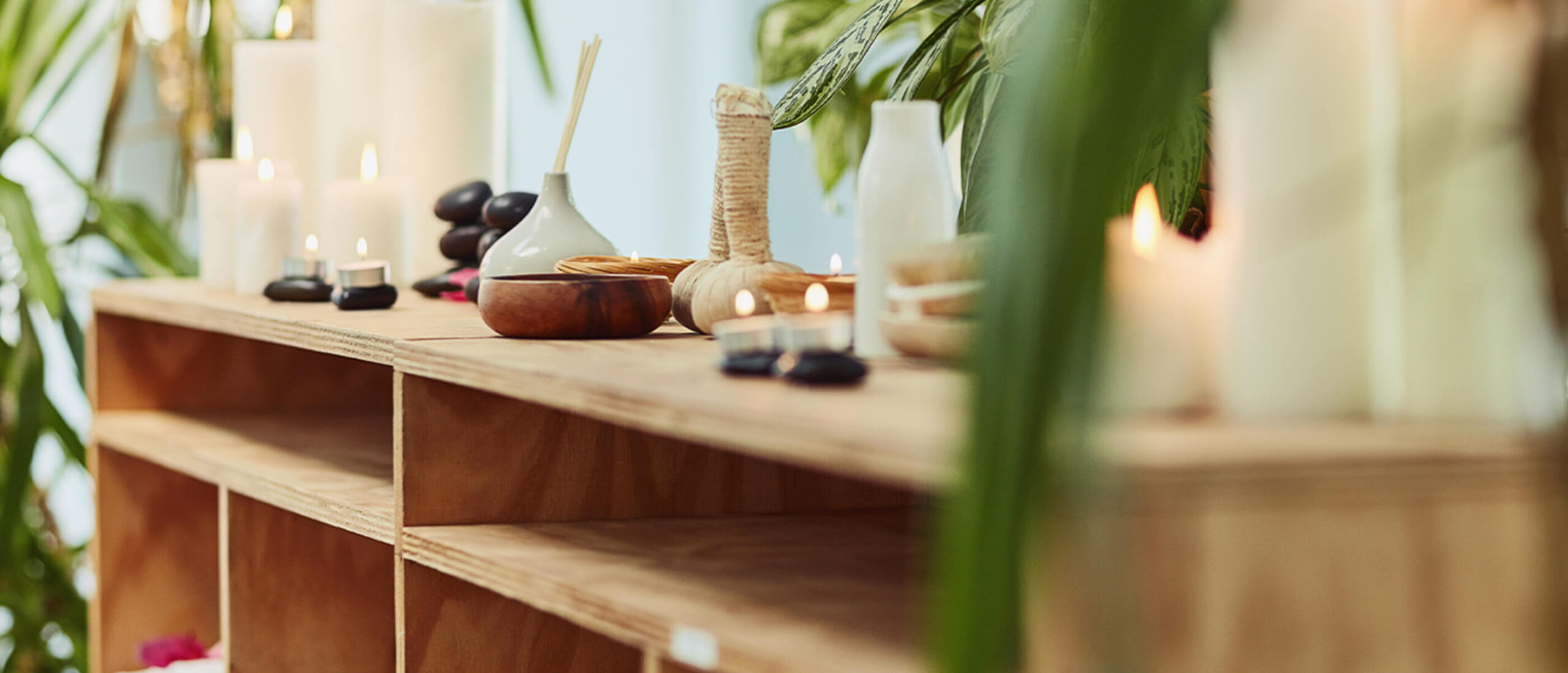 観葉植物や小さな滝が設置されたリラクゼーションサロンで、